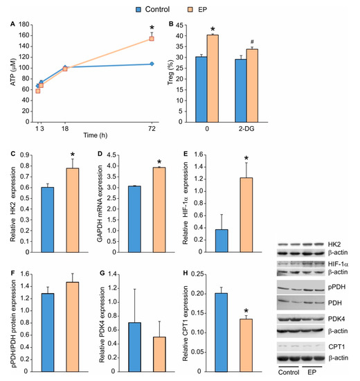 The influence of EP on metabolic pathways in differentiating Treg. (A) ATP cell content measured by chemiluminescence method in cells first exposed to a conventional Treg differentiating cocktail for 24 h and after EP treatment, at indicated time points. (B) The effect of 2-deoxyglucose (2-DG) on Treg (CD4+CD25highFoxP3+) proportion in control cells or EP-treated cells, measured 72 h after 2-DG addition. Relative protein expression (compared to β-actin or the total protein form) measured by immunoblot 72 h after EP administration: (C) HK2, (E) HIF-1α, (F) phosphorylated PDH (pPDH), (G) PDK4 and (H) CPT1. (D) Relative GAPDH mRNA expression (compared to β-actin) measured 72 h after EP administration. Representative blots are shown on the right-hand side. * p < 0.05 represents the significant difference of EP-treated cells in comparison to control cells, while # p < 0.05 represents the significant difference between 2-DG+EP-treated cells in comparison to EP-treated cells.