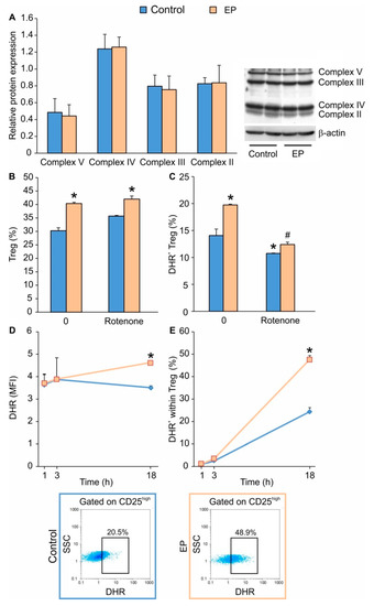 The effect of EP on oxidative phosphorylation (OXPHOS) and ROS production in differentiating Treg. (A) Relative protein expression of mitochondrial transport chain complexes 72 h after EP administration. The impact of rotenone (simultaneously applied with EP) on (B) EP-driven Treg (CD4+CD25highFoxP3+) proportion or (C) ROS formation, measured by dihydrorhodamine 123 (DHR) staining. (D) Timeline of ROS production per Treg (CD4+CD25high) and (E) the proportion of ROS-producing Treg in control and EP-treated cells. Representative dot plots are shown below the graph. * p < 0.05 represents the significant difference of EP- or rotenone-treated cells in comparison to untreated control cells, while # p < 0.05 represents the significant difference between rotenone+EP-treated cells in comparison to EP-treated cells.