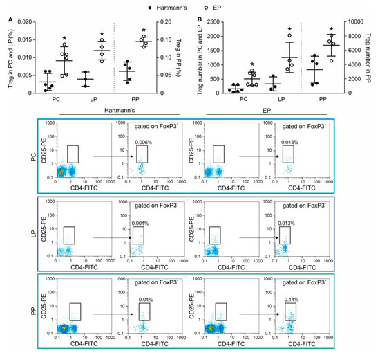 In Vivo EP influence on Treg numbers in the peritoneum and the gut immune system. EP was applied either by intraperitoneal injections or through the oral route to healthy C57BL/6 mice and (A) the proportion and (B) the number of Treg (CD4+CD25highFoxP3+) was determined ex vivo from the cell suspensions of peritoneal cells (PC), Peyer’s patches (PP), or lamina propria cells (LP). Representative dot plots and gating strategy are shown below the graph. * p < 0.05 represents the significant difference between EP-treated mice compared to vehicle-treated mice.