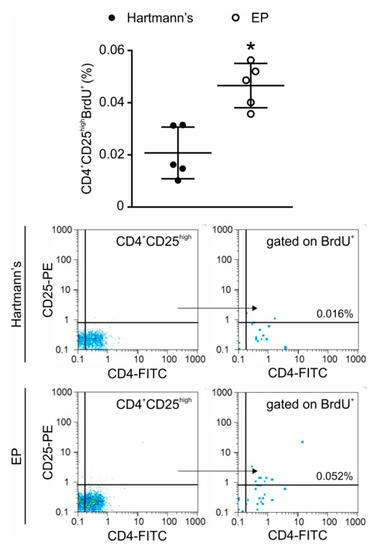 Treg proliferation after intraperitoneal EP application. EP was administered twice a day for two days, while BrdU was applied intraperitoneally 24 h before ex vivo analysis. Treg (CD4+CD25high) proliferation was determined by flow cytometry. Representative dot plots and gating strategy are shown below the graph. * p < 0.05 represents the significant difference between EP-treated mice compared to vehicle-treated mice.