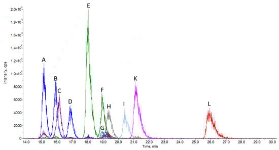 Chromatogram of sterol standards: zymosterol (A), 24-dehydrolathosterol (B), 7-dehydrodesmosterol (C), desmosterol (D), zymostenol (E), lathosterol (F), lathosterol-d7 (G), FFMAS (H), TMAS (I), lanosterol (K), and dihydrolanosterol (L). The peak (J) is dedicated to cholesterol and is not presented in this chromatogram. Cholesterol is not assayed, since its concentration is several orders of magnitude larger than other sterols. Cholesterol was assayed using a separate analytical method. Separation conditions are described in Section 3.3 LC-MS Analysis.
