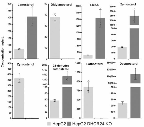 Concentrations of sterol intermediates isolated from HepG2 and HepG2 DHCR-KO cell lines. All concentrations are calculated as ng/mL per 107, to normalize sterol concentration based on the number of counted cells. All data are represented as mean with SD, black dots represent individual measurements.