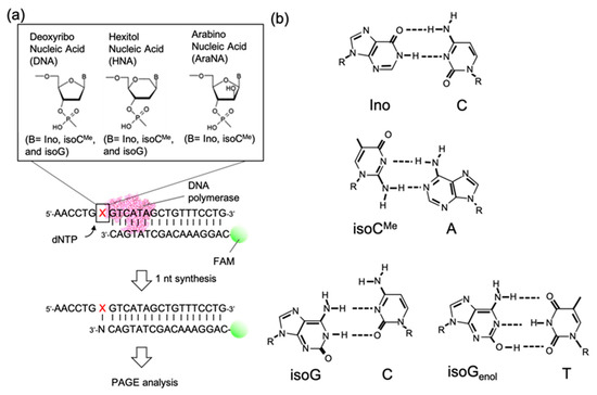 All the template DNAs were designed as 5′-AACCTG-X-GTCATAGCTGTTTCCTG-3′. In the position of X, Ino-DNA, Ino-HNA, InoAraNA, isoG-DNA, isoG-HNA, isoGAraNA, isoCMe-DNA, or isoCMe-HNA were introduced. All the synthesis and purifications were done as previously reported [12]. The HPLC-grade of FAM-labelled DNA primer (5′- CAGGAAACAGCTATGAC-3′) was purchased from Japan Bio Service.
