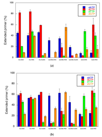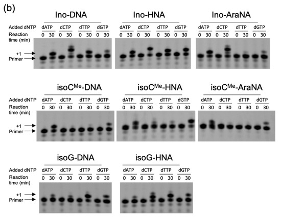 As shown in Figure 3, the fidelity of the primer extension was also different in each case. In this study, we evaluated the fidelity as the score of preference that indicated how much the most proffered dNTP was incorporated in the reaction. The score of the preference was calculated as the value of the highest efficiency (extended primer (%)) among the substrate dNTPs divided by the summed values of each efficiency (Table 1). According to this calculation, Ino-DNA, isoCMe-DNA, and isoG-DNA showed preferences of 52.4%, 75.9%, and 64.5%, respectively. It is important to mention that the efficiency magnitude trend was opposed to the preference, as the order of efficiency is Ino-DNA > isoG-DNA > isoCMe-DNA, whereas that of preference is isoCMe-DNA > isoG-DNA > Ino-DNA. This relationship might indicate that the efficiency could be dominant by the formation of hydrogen bonding as the fixation of the base orientation by hydrogen bonding should be advantageous for the polymerase reaction in the active site of the polymerase. However, such a hydrogen bonding formation possibility with other dNTPs provides the chance to incorporate with the active site, resulting in low fidelity. However, the fidelity could be dominant by the base-stacking interaction. As the base-stacking interaction shows the complementary relationship with hydrogen bonding [3], the incorporation of bases by stacking dominant manner would decrease the chance of the formation of hydrogen bonding with dNTP, which lowers the efficiency but increases the fidelity.