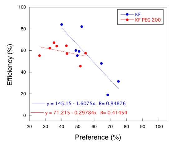 Plots of the efficiency versus preference of the primer extension by KF in the absence (blue plots) and presence of PEG 200 (red plots).