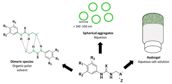 Our own work in this area has led to the development of a novel class of supramolecular self-associating amphiphilic salts (SSAs). To date, a library of >50 SSAs and structurally related compounds have been synthesized. The self-associative properties of this compound library and any resultant aggregate structure have also been characterised, using a variety of complementary experimental techniques (Figure 1) [16,17,18,19,20,21,22,23]. A series of solid state, single crystal X-ray diffraction studies have shown the intermolecular binding mode adopted by the anionic component of an SSA to be cation dependent [17]. Here the presence of the weakly coordinating tetrabutylammonium (TBA) counter cation was found to result in the formation of thio/urea-anion dimers however, the formation of thio/urea-thio/urea stacks were induced by the presence of a strongly coordinating counter cation such as sodium or potassium. Whereby, a moderately competitive counter cation such as the pyridinium ion, resulted in the formation of thio/urea-anionic tapes. Additionally, solution state studies have shown the anionic component of an SSA to also produce hydrogen-bonded dimers in a competitive organic solvent system (DMSO-d6). However, in an aqueous environment, the SSA monomeric units have been shown to form spherical aggregates, with hydrodynamic diameters of c.a. 100–550 nm in size [18,20] and/or hydrogels [23].