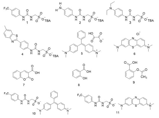 The synthesis of 1 [16], 2 [20], and 4 [18] have been previously published. SSA 3 was prepared through the reaction of diethylphenyldiamine and triphosgene in chloroform. This was followed by the addition of TBA aminomethanesulfonate. The pure product was obtained as a brown oil in a yield of 55%. Compounds 10 and 11 were both synthesised through the reaction of aminomethanesulfonic acid and trifluoromethylphenyl isocyanate in pyridine, to produce a pyridinium SSA intermediate [20]. The oxalate salt of malachite green (10) or the chloride salt of methylene blue (11) were added to a solution of this intermediate in methanol as appropriate. Following further purification SSA 10 was obtained as a blue/brown solid with a yield of 72% and 11 as a blue solid with a yield of 65%. Co-formulations a–j were prepared by dissolving the appropriate SSA (1–4) in methanol, followed by the addition of the secondary competitive species (one equivalent).