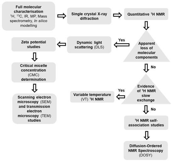 Due to the complex nature of SSA self-association events, and now with the inherent additional complexities of adding competitive species to an SSA system, we have developed an effective multi-component experimental approach to enable characterisation of these complex mixtures. The SSA characterisation process we have developed is shown in Figure 3. Within this flow chart we have included mention of scanning/transmission electron microscopy (SEM/TEM) studies however, these characterisation methods are not discussed further within the scope of this work as SSA self-associated spherical aggregates have previously been shown not to survive SEM/TEM sample preparation methods [16].