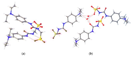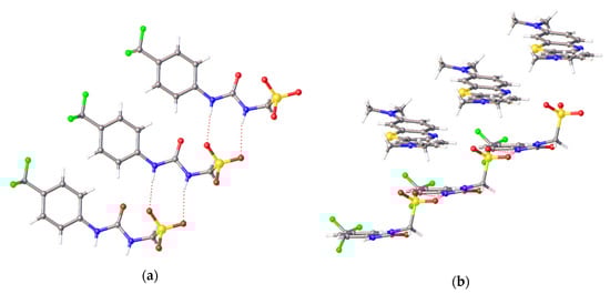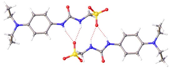 A crystal structure obtained for compound 11 highlights the effects of an additive cationic, aromatic drug-like species on SSA self-association events. We have previously shown that the presence of a TBA counter-cation results in the formation of thio/urea-anion dimers with an internal angle of dimerization = 22.60° [17]. Where the TBA cation is replaced with the methylene blue cation, the anionic component no longer dimerizes, but instead forms a hydrogen-bonded tape (Figure 6a). The molecular self-association is stabilised through the formation of two intermolecular hydrogen bonds between the urea and sulfonate functionalities. Additionally, the methylene blue cation stacks in sheets above and below those of the SSA anionic components, shown in Figure 6b.