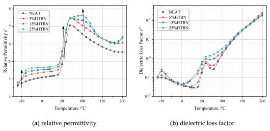 Temperature spectrum characteristics of complex permittivity with different liquid rubber contents at 50 Hz are shown in Figure 1, in which Figure 1a is the relative permittivity ε′, and Figure 1b is the dielectric loss factor ε″. The ε′ has a marked increase in composites toughened using liquid rubber. Furthermore, along the arrow in Figure 1a, the dielectric relaxations in the low- (from −60 °C to –10 °C), medium- (from 0 °C to 90 °C) and high-temperature region (from 90 °C to 200 °C) are also changed.