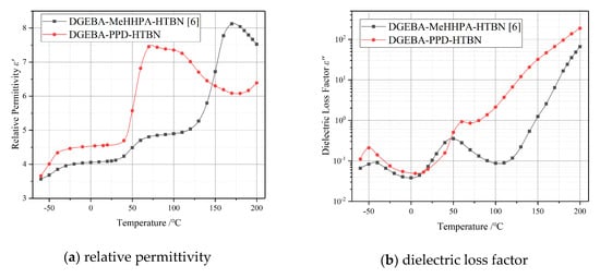 Two different curing agents, methylhexahydrophthalic anhydride (MeHHPA) and polyoxide propylene diamine (PPD), were used in the previous study [] and this research respectively. Compared to the temperature spectrum characteristics in Figure 2, the polarization process of DGEBA-PPD-HTBN is stronger than that of DGEBA-MeHHPA-HTBN in the temperature range of 50 °C to 150 °C. This may be caused by the interfacial polarization, and the analysis of this part will be carried out in Section 2.4.