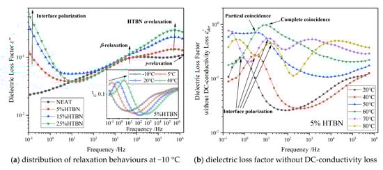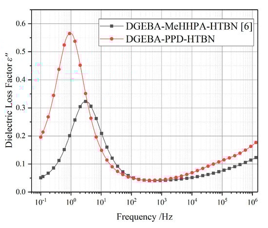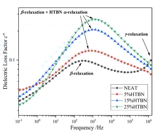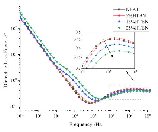 In Figure 3, a high-frequency tail in pure epoxy resin represents the γ relaxation, and the relaxation peak of the pure epoxy resin may appear at a higher frequency above 106 Hz. However, the dielectric loss factor declines at high frequency in all samples with HTBN. The γ relaxation is partly attributed to the local motions of dipoles associated with the unreacted epoxy groups and amine groups [], and the flexible rubber molecule could increase the extent of reaction and reduce the unreached groups in the matrix []. Therefore, due to the introduction of the HTBN molecules, the γ relaxation process is restrained instead of moving to a higher frequency as in pure epoxy resin.