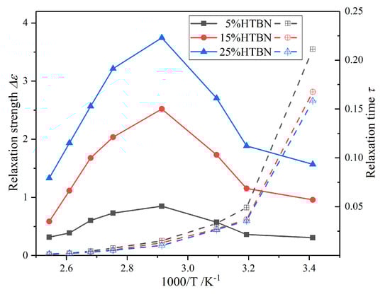 In Figure 6, under the same temperature and filler contents, the relaxation time of the interfacial polarization in DGEBA-MeHHPA-HTBN is slightly slower than that of DGEBA-PPD-HTBN, but the relaxation strength is 1.8 times higher. This is because it is difficult for HTBN to participate in the curing reaction of the amine formulation system and it increases the number of HTBN particles in the matrix. Moreover, due to the different glass transition temperature, the changing trend of the polarization with temperature may also be different. Therefore, the curing agent has a significant influence on the relaxation properties of epoxy/liquid rubber composites.