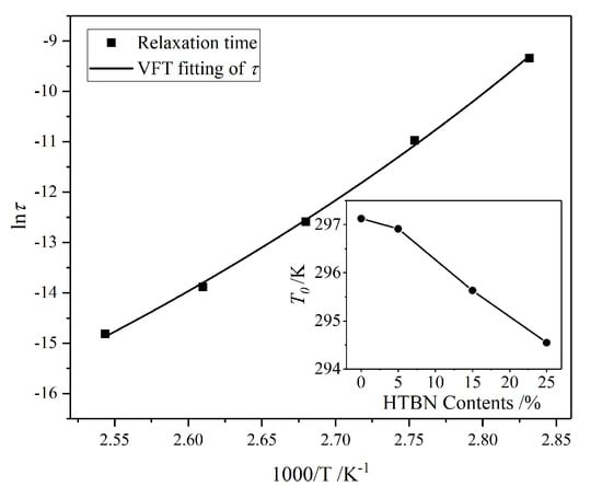 Relationship between relaxation time of epoxy resin α relaxation and reversed temperature. Insert figure: Vogel temperature of α relaxation with different HTBN contents.