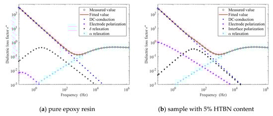 The HN-equation fitting results of ε″ at 90 °C are demonstrated in Figure 9. The relaxation peak of the pure epoxy resin appears at low frequency, which has been found in other studies []. This is caused by the hopping of mobile ion. On the one hand, the hopping of ion forms dipoles and establishes polarization, as in Figure 9a, which is also called thermionic polarization (δ relaxation) [,]. On the other hand, the directional migration of ions can form conduction current [,]. However, the sample with 5% HTBN content shows a distinct process in Figure 9b. Therefore, the addition of HTBN may change the hopping behaviour.