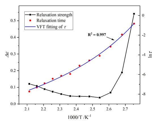 Furthermore, there is a nonlinear relation between the natural logarithm of the relaxation time and the reversed temperature. Therefore, this relation could be described by the Vogel‒Fulcher‒Tammann equation (VFT-equation):