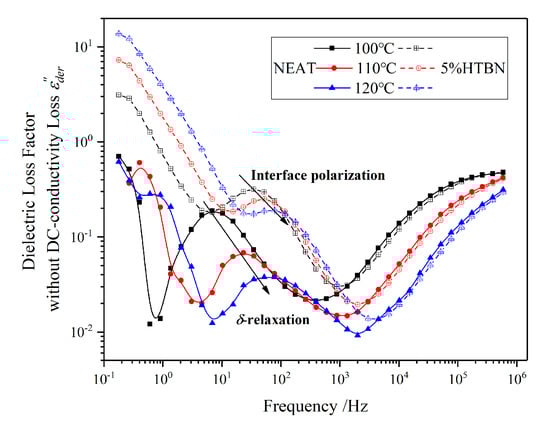Along with the arrows in Figure 11, the polarization of the sample with 5% HTBN content in medium frequency describes the interfacial polarization. With the increase of temperature, the peaks are close to the δ relaxation of pure epoxy resin. In addition, when the temperature is 120 °C, the difference between the two polarizations is almost an order of magnitude. Therefore, the motion of the impurity ions could be affected by the interfacial polarization. The bound charge accumulating on the interface between the rubber and epoxy matrix may restrain the δ relaxation likewise.