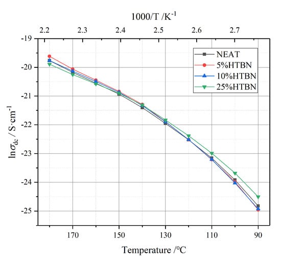 The factors that determine the conductivity are the concentration and the mobility of impurity ions [,]. The addition of HTBN introduces more impurity ions into the polymers. As previously mentioned, the interface acts as a charge collector, which could cause the distortion of the electric field and impede the migration of carriers. These two factors give rise to a change in the σdc. Therefore, according to the intersection in Figure 12, we could infer that the former factor dominates when the temperature is below 150 °C. The density of impurity ions rises with the increase of filler content, leading to the maximum σdc of the sample with 25% HTBN content, and the latter dominates when the temperature is above 150 °C; the obstruction to carrier migration is intensified due to the larger interface in the sample with a high filler ratio. Thus, the samples with filler ratios of 15% and 25% present a lower DC-conductivity than the pure epoxy resin.