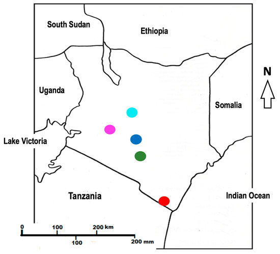 Map of Kenya showing the following sampling points: Gazi coast (red), Machakos (green), Nairobi (blue), Nanyuki (cyan), and Narok (purple).