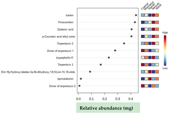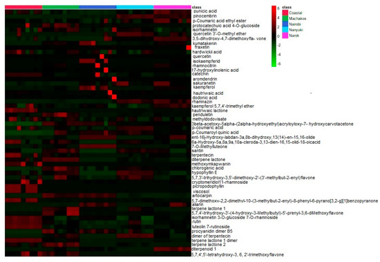 Absolute quantification of discriminants identified from the five different collections of D. viscosa plants (Table 3) showed that the Nanyuki population had the highest relative abundance of six chemical markers (santin, pinocembrin, dodonic acid, p-coumaric acid ethyl ester, terpenticin 2, and hypophyllin E) (Figure 5). The Gazi coastal and Nairobi plants each had higher levels of three and two chemicals, respectively, that discriminated the collections based on site. For the coastal types, two dimers of terpentecin and terpenticin 1 were differentially accumulating. As opposed to this, the Nairobi group had kumatakenin and ent-16j-hydroxy-labdan-3a,8b-dihydroxy,13(14)-en-15,16-olide as the chemicals that were upregulated.