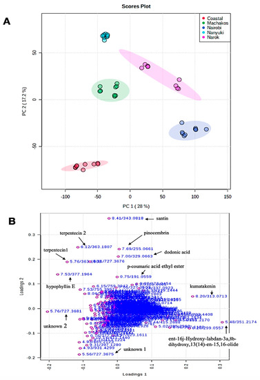(A) Principal component analysis (PCA) score plot showing variation of D. viscosa plants from different natural population five different locations in Kenya, i.e., coastal region (red color), Machakos (green color), Nairobi (blue color), Nanyuki (cyan color), and Narok (purple color); (B) PCA loadings plot of compounds that influenced the differentiation of collections into separate clusters.