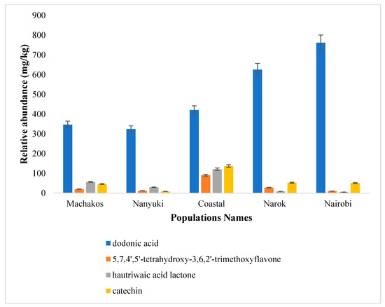 The relative abundance of dodonic acid (1) was high in all the five populations, whereas hautriwaic acid lactone (3) was present in Nanyuki, Machakos and Gazi coastal collections (Figure 6). In addition, the relative abundance of 5,7,4′,5′-tetrahydroxy-3,6,2′-trimethoxyflavone (2) was high in the Gazi coastal plants as compared with the other groups.