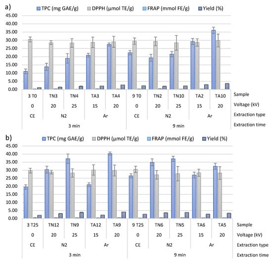 | Sample | High Voltage Treatment Time (min) | Voltage (kV) | Ethanol Content (%) | Stirring (min) | Extraction Type |