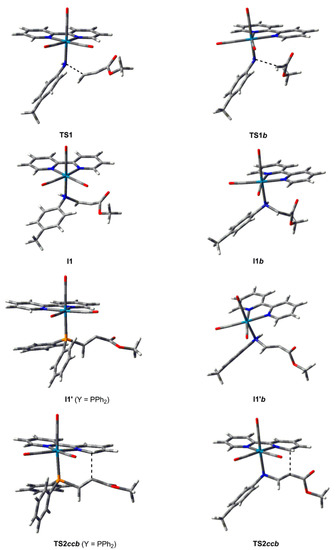 As just mentioned in the Introduction section, experimental studies on the reactivity of the complexes [ReY(CO)3(N-N)] (Y = NHpTol, OH, OMe, PPh2; N-N = bipy and/or phen) towards activated alkynes (HMAD and/or DMAD) have shown the formation of three types of products (see Scheme 1) [48,51,52,53,54]. Theoretical investigations using the bipy ligand and the HMAD activated alkyne have not only corroborated the formation of such products, but also shown all the species involved in the reaction mechanisms leading to the Pcco/Pccoh, Pccb, and Pins products [57,58]. Looking at the reaction mechanisms involved, three different patterns of potential energy surfaces (PES) were found [58]. The type-I PES found for Y = OH and PPh2 starts with the nucleophilic attack of the Y ligand on the non-substituted acetylenic carbon of HMAD (C1) through the TS TS1 to give a zwitterionic intermediate (I1), in which a new HO/Ph2P-C1 bond is formed and, consequently, the original triple bond between C1 and the substituted acetylenic carbon of the HMAD fragment (C2) presents now a double bond character (see Scheme 2). Evolving via TS1′, I1 isomerizes into another intermediate (I1′) wherein C2 is readily oriented to yield any of the products. I1′ is the common precursor species of Pcco/Pccoh, Pccb, and Pins via the TS TS2cco, TS2ccb, and TS2ins, respectively (see Scheme 2). For OH, Pcco evolves to Pccoh through an intermolecular transformation with a Gibbs energy barrier lower than that found for the nucleophilic attack step [58]. This fact along with the greater stability of Pccoh over Pcco explains the formation of the former product as experimentally observed [52]. A different PES named as type II was found for OMe (see Scheme 3). Reactants evolve to I1 via TS1, which in turn directly transforms into Pcco via TS1′. Pcco is now the species from which the products Pccb and Pins are formed via TS2ccb and TS2ins, respectively. All these species show structures analogous to those identified with the same acronyms on the type-I PES. The type-III PES was obtained for the NHpTol case wherein two splitting species were found, the first one being the reactants (see Scheme 4). On the one hand, reactants may become I1, first, and then Pcco passing through TS1 and TS1′, respectively. Pcco can lead to either Pccoh as in the OH case [58] or Pins via TS2ins. On the other hand, reactants may proceed through TS1b for the attack of the NHpTol ligand on the C1 atom of the alkyne fragment, which is oriented in the opposite direction to that presented at TS1 or TS1′ (see Scheme 4 and Figure 1). TS1b evolves to the corresponding intermediate I1b, in which the new HpTolN-C1 bond is just established. I1b becomes an isomer I1′b without any TS to finally give Pccb via TS2ccb. I1′b mainly differs from I1b in the orientation of the C2-bonded CO2Me group of the alkyne moiety. This group and the C1-bonded H atom are on opposite sides of the C1=C2 double bond at I1b, while at I1′b they are on the same side to favour the attack of C2 on the bipy ligand (see Scheme 4 and Figure 1). All the species implied in the reaction mechanism for the formation of Pccoh and Pins display structures analogous to those denoted with the same acronyms on the type-I and II PES. However, for the reaction mechanism leading to Pccb, the geometry discrepancy mentioned above between TS1b and TS1 or TS1′ is also present when comparing I1b and I1′b with I1 and I1′ (when located for OH and PPh2), respectively (see Figure 1). In addition, we also note that the plane defined by the heteroatom of the NHpTol ligand, C1, and C2 is practically perpendicular to the plane defined by Re and the bipy ligand at I1′, while an almost parallel disposition between these planes was located at I1′b. A similar geometry difference was detected when comparing the TS TS2ccb located for OH and PPh2 with the one found for NHpTol (see, for instance, TS2ccb for PPh2 and NHpTol in Figure 1). Intermediates analogous to I1b and/or I1′b were also located when Y = OH, OMe, and PPh2, but TS2ccb connects Pccb with I1′ (Pcco for the OMe case) instead of I1b and/or I1′b [58].