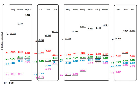 Energies (in eV) of the five highest occupied orbitals in the reactant complexes [ReY(CO)3(bipy)] (Y = NH2, NHMe, NHpTol, OH, OMe, OPh, PH2, PHMe, PMe2, PHPh, PPh2, PMePh, SH, SMe, SPh).