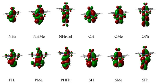 Pictures of the computed HOMO of the reactant complexes [ReY(CO)3(bipy)] (Y = NH2, NHMe, NHpTol, OH, OMe, OPh, PH2, PMe2, PHPh, SH, SMe, SPh).