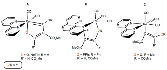 Rhenium(I) fac-tricarbonyl complexes bearing conjugated diimine bidentate ligands (i.e., bipyridines, phenanthrolines, etc.) and neutral or anionic monodentate ligands (e.g., halides, pyridines, aqua, phosphines, alkyls, etc.) are functional molecules with applications in several important areas, such as catalytic reduction of CO2 [1,2,3,4,5,6,7,8,9,10,11,12,13,14,15,16], luminescence [17,18,19,20,21,22,23,24,25,26,27,28,29,30], medicinal chemistry [31,32,33,34,35,36,37,38,39,40,41,42,43,44,45,46], supramolecular chemistry [47], etc. We reported, among others, the synthesis of the complexes [ReY(CO)3(N-N)] (Y = alkoxo [48,49], amido [50,51], hydroxo [52], phosphido [53,54], thiolato [55]; N-N = 2,2′-bipyridine (bipy) and/or 1,10 phenanthroline (phen)). The Y ligand in these complexes bears one or more lone electron pairs. Due to their filled d6 electron configuration, the Y ligands cannot act as π-donors in these complexes (see Supporting Information for more details). On the other hand, the kinetically inert character of these d6 third row complexes prevents the formation of Y-bridged polynuclear species. These new compounds showed different reactivity patterns when reacting towards activated alkynes such as methyl propiolate (HC≡CCO2Me = HMAD) and/or dimethylacetylenedicarboxylate (MeO2CC≡CCO2Me = DMAD). The first step is common and consists in a nucleophilic attack from the heteroatom (O, N, P) of the Y ligand onto an acetylene carbon atom, generating a zwitteronic species, which evolves to afford different types of products [56]. Specifically, the Re complexes with Y = NHpTol (para-tolylamido) and OH (hydroxo) led to the formation of a coupling product with one of the carbonyl ligands in cis disposition to Y. This carbonyl oxygen is protonated while the N and O atoms of the Y ligand have lost their respective hydrogen atoms (see A in Scheme 1, Pccoh products). It is thought that there is another stable species prior to the formation of Pccoh, denoted as Pcco, where the carbonyl oxygen is not protonated while the N and O atoms of the Y ligand still display the hydrogen atom [51,52]. A coupling product with one of the non-subtituted ortho carbons of the bidentate ligand was obtained for the Re complex containing the diphenylphosphanido (PPh2) ligand (see B in Scheme 1, Pccb products) [53,54]. Finally, for the Re methoxo (OMe) complex, the product obtained corresponds to the alkyne insertion into the Re-OMe bond (see C in Scheme 1, Pins products) [48].