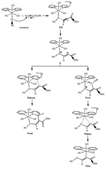Schematic structures of the species located on the type-II PES found for the reaction of the complex [Re(OMe)(CO)3(bipy)] towards HMAD. The connectivities among these species are also shown with arrows. Acetylenic carbon atoms of HMAD are numbered both in the isolated reactant and in TS1.