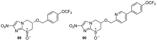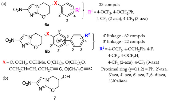 - Thompson, A.M.; O’Connor, P.D.; Marshall, A.J.; Yardley, V.; Maes, L.; Gupta, S.; Launay, D.; Braillard, S.; Chatelain, E.; Franzblau, S.G.; et al. 7-Substituted 2-Nitro-5,6-dihydroimidazo[2,1-b][1,3]oxazines: Novel antitubercular agents lead to a new preclinical candidate for visceral leishmaniasis. J. Med. Chem. 2017, 60, 4212–4233. [Google Scholar] [CrossRef] [PubMed]