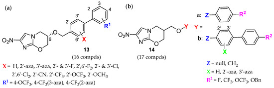 - Kmentova, I.; Sutherland, H.S.; Palmer, B.D.; Blaser, A.; Franzblau, S.G.; Wan, B.; Wang, Y.; Ma, Z.; Denny, W.A.; Thompson, A.M. Synthesis and structure-activity relationships of aza- and diazabiphenyl analogues of the antitubercular drug (6S)-2-nitro-6-{[4-(trifluoromethoxy)benzyl]oxy}-6,7-dihydro-5H-imidazo[2,1-b][1,3]oxazine (PA-824). J. Med. Chem. 2010, 53, 8421–8439. [Google Scholar] [CrossRef]
