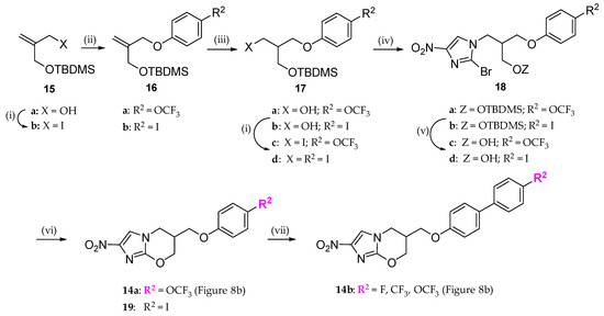 - Palmer, B.D.; Thompson, A.M.; Sutherland, H.S.; Blaser, A.; Kmentova, I.; Franzblau, S.G.; Wan, B.; Wang, Y.; Ma, Z.; Denny, W.A. Synthesis and structure-activity studies of biphenyl analogues of the tuberculosis drug (6S)-2-nitro-6-{[4-(trifluoromethoxy)benzyl]oxy}-6,7-dihydro-5H-imidazo[2,1-b][1,3]oxazine (PA-824). J. Med. Chem. 2010, 53, 282–294. [Google Scholar] [CrossRef]