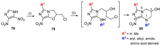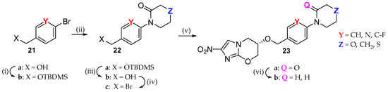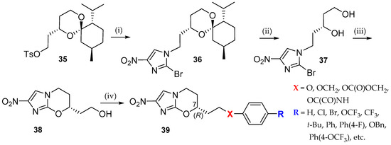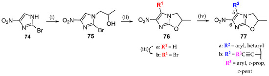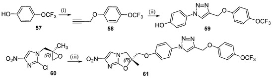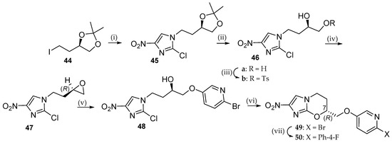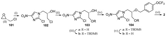 - Chen, G.; Zhu, M.; Chen, Y.; Miao, X.; Guo, M.; Jiang, N.; Zhai, X. An efficient and practical protocol for the production of pretomanid (PA-824) via a novel synthetic strategy. Chem. Pap. 2020, 74, 3937–3945. [Google Scholar] [CrossRef]