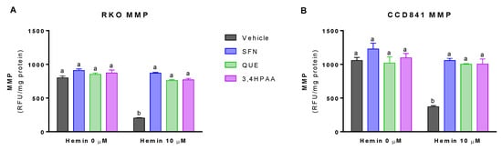 Effect of hemin, SFN, QUE and 3,4HPAA in MMP. Cells were incubated with vehicle (0.4% DMSO), 1 μM SFN, 10 μM QUE or 2.6 μM 3,4HPAA in the absence or presence of 10 μM hemin. After 72 h, MMP was measured by fluorescence in (A) RKO; and (B) CCD841 cell supernatants. Results were expressed as RFU/mg of protein. Values are expressed as mean ± SEM, from three independent culture preparations. For all bars with the same letter, the difference between the means is not statistically significant. The values with different letters indicate significant differences (p < 0.05) between bars (two-way ANOVA, Bonferroni post-test3,4HPAA, 3,4-dihydroxyphenylacetic acid; MMP, mitochondrial membrane potential; QUE, quercetin; SFN, sulforaphane; RFU, relative fluorescence unit.