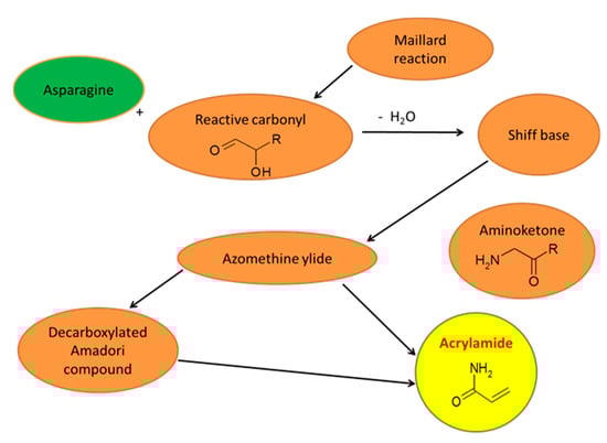 Acrylamide (AA) can be formed in heated food not only in Maillard reactions and transformations of acrolein, but also by the conversion of bacrylic acid, wheat gluten, or by de-amination of 3-aminopropionamide or as a result of asparagine enzymatic decarboxylation [3,30,31,37,40]. However, Maillard reactions remain the main route for acrylamide formation as the result of a non-reactive matrix (starch or protein) presence.