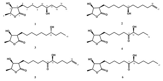 Butanolides (γ-butyrolactones) are four-carbon heterocyclic lactone ring structures reported from some specific families (Myristicaceae [26], Meliaceae [10], Actinomycetes [27,28,29,30,31]), especially in Lauraceae plants (Machilus sp. [32,33,34], Lindera sp. [35,36], Litsea sp. [37], Cinnamomum sp. [38,39,40], Persea sp. [41]). The characteristic butanolides in Lauraceae plants contain an alkyl side chain group at C-2, a hydroxy group at C-3, and one methyl group at C-4, with or without a double bond between C-2/C-3 and C-2/C-6. In this report, six new compounds, machinolides A–F (1–6), were butanolide compounds without a double bond between C-2/C-3 or C-2/C-6. This type of butanolide has not been isolated from Machilus before, which might improve our understanding of secondary metabolites from Machilus species. The chemical results can contribute to the chemotaxonomy of Machilus species.