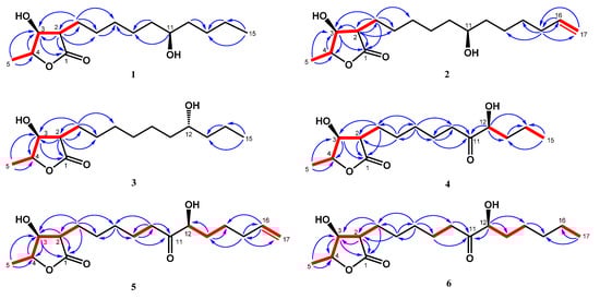 Key 1H-1H COSY (━) and HMBC (H→C) correlations of machinolides A–F (1–6).
