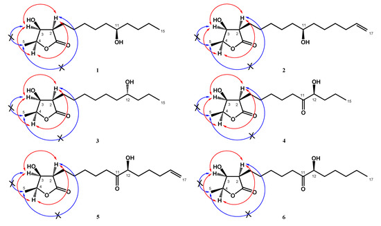NOESY (H↔H) correlations of machinolides A–F (1–6).