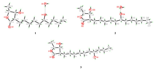 Compound 3 was yielded as colorless needles and assigned the molecular formula C15H28O4 through analysis of its HRESIMS data (m/z 273.20656 [M + H]+ (calcd. for 273.20658). All the spectra of 3 were similar to those of 1. However, electron ionization mass spectra (EIMS) showed the different fragments between 3 (m/z 215 (56), 186 (37)) and 1 (m/z 229 (39), 200 (24)), which suggests that the position of the hydroxy group in the alkyl chain was different. The hydroxy group of 3 was located at C-12 and the absolute configuration of 3 was assigned as 2R,3S,4S,12R-form, which were both determined by single-crystal X-ray diffraction (Figure 4). Therefore, compound 3 was named machinolide C, and its structure was further confirmed by COSY and HMBC experiments (Figure 2).