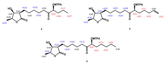 Compound 5 was isolated as a colorless oil. The ESIMS (m/z 313 [M + H]+) and HRESIMS (m/z 335.18295 [M + Na]+ (calcd. for 335.18290)) data were used to establish the molecular formula of compound 5 as C17H28O5. The 1H-NMR spectrum of 5 was similar to that of 4, except for the presence of a terminal double bond at δH 5.78 (1H, ddt, J = 17.2, 10.4, 6.8 Hz, H-16), 4.98 (1H, m, H-17b), and 5.03 (1H, m, H-17a) in 4 (Table 2). The HMBC correlation between H-15/C-16, C-17, H-16/C-15, and the COSY correlation between H-16/H-17 supports the presence of a terminal double bond (Figure 2). The CD spectrum (a negative cotton effect at 217.5 nm) and NOESY correlation (Figure 3) of 5 were also similar to 4. Moreover, in accordance with the 13C-NMR-based empirical rules [11], the chemical shifts of C-3 and C-4 in 5 were similar to those of 2R,3S,4S-form compounds in the previous data [11], showing that the absolute configuration of 6 was 2R,3S,4S-form. The absolute configuration of C-12 in 5 was established as S-form by Mosher’s method (Figure 5). On the basis of the above results, the structure and absolute configuration of 5 were determined and named machinolide E.