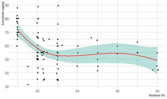 As regards bread, bread rolls, and wholemeal bread, a slight negative correlation emerged between the final AA levels and the moisture percentage of the dough before the baking process (Spearman’s rank correlation ρ = −0.44, p-value < 0.001). As a matter of fact, Figure 1 shows a curvilinear relationship between the starting moisture percentage and the levels of AA in the finished product (Figure 1). According to this figure, the content of AA is characterized by a sharp increase below the 43% moisture percentage of the dough. Several studies reported that low-moisture triggers acrylamide formation, especially in starchy food, and this evidence might be explained by water evaporation that influences the temperature of the surface of the product during the baking process, thus delaying the formation of AA [23,24,25].