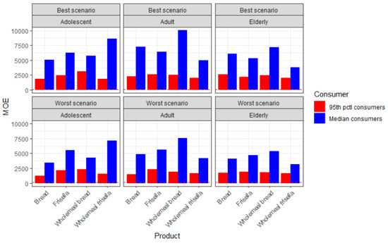 Higher exposure values occurred among adolescents either median or consumers at the 95th percentile, and this was due either to the dietary habits or the lower body weight of younger consumers (Table 4 and Table 5). Besides, adolescents also showed the lowest exposure value as regards the product wholemeal Friselle: this was due to the fact that the consumption of this product is not common among young individuals. In the case of median elderly consumers, their exposure through bread and product thereof is always higher than adults, due to higher consumption rates, also considering that the same body weight was used for both age groups. Quite the opposite applies in consumers at the 95th percentile, where the consumption rates of adults are higher or comparable to the data of the elderly, except for “Friselle”, which is made of refined flour.