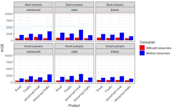 Margins of exposure (MOE) values for the carcinogenicity of acrylamide (AA) through the consumption of bread and products thereof, across different consumers and according to best and worst scenarios (the y-intercept at 10,000 is a threshold, as it accounts for the minimum value at which the carcinogenic MOE is considered of low concern).