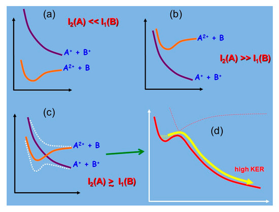 From these arguments, thermodynamically stable diatomic dications are expected to be formed between atoms with low first and second ionization potentials (i.e., divalent metal atoms, like the alkaline earths) and atoms with large first ionization energies, such as the noble gases and the halogens. On the basis of this rationalization, and according to the relative potential energy curves scheme of Figure 1, we can summarize saying that, in general, doubly charged molecular dications are usually unstable species, because of their high formation energy. In the gas phase, the two charged parts of the dication tend to repel each other, making this species metastable, when Δ ≥ 0 with a subsequent avoided crossing between the two potential energy curves describing the A2+ + B and A+ + B+ interactions, and more often unstable (when Δ > 0), determining the fragmentation in two positive ions by the so called Coulomb explosion often with a high kinetic energy release (KER) as depicted in Figure 1b,d.