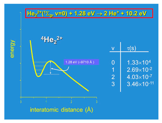 Historically, the study of diatomic dications has not followed the logic presented above. The existence of doubly charged ions was first suggested either by Thompson [14] and Conrad [15] by the discovery of He2+ dications in their discharge experiments, as cited by Aston in his pioneering work on mass spectrometry [16]. Their identification was achieved first by Vaugham [17] with the discovery of CO2+ in 1931 and its characterization in term of the ionization energy appearance’s threshold. During the same period, the unexpected stability of molecular dications has been investigated extensively also from a theoretical point of view, and in 1933, Linus Pauling was the first carrying out valence bond calculations [18]: The simplest diatomic dication, He22+, was characterized as a metastable species having a well depth of about 1.28 eV, supporting four vibrational levels, with an extremely long lifetime (of about 220 min for the v = 0 level), with an energy content exceptionally high (10.15 eV), which is easily releasable as KER of the two He+ fragments formed by Coulomb explosion [18]. These important characteristics, which are summarized in Figure 2, allowed Nicolaides [19] to discuss new types of fuels involving the generation of propulsive energy via the following processes (see Equations (2)−(10) below):
