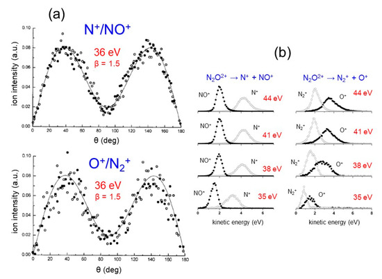 Data from the double photoionization of N2O by synchrotron radiation in the 30–50 photon energy range: (a) the angular distributions obtained for the two fragmentation channels (see Equations (17) and (18) in the text) at a photon energy of 36 eV [80]; the black points refer to the diatomic ions NO+ or N2+ and the open circles to the atomic N+ or O+ ones; the best fitting of the experimental data allowed the determination of the anisotropy parameter β (see text); (b) the KER distributions for single product ions of reactions (17) and (18) occurring by the Coulomb explosion of the metastable N2O2+ molecular dication [80].
