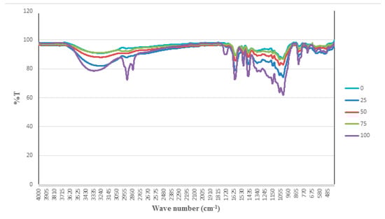 Infrared spectra of Psychotria malayana leaf extracts (0%, 25%, 50%, 75%, and 100% methanol-water).